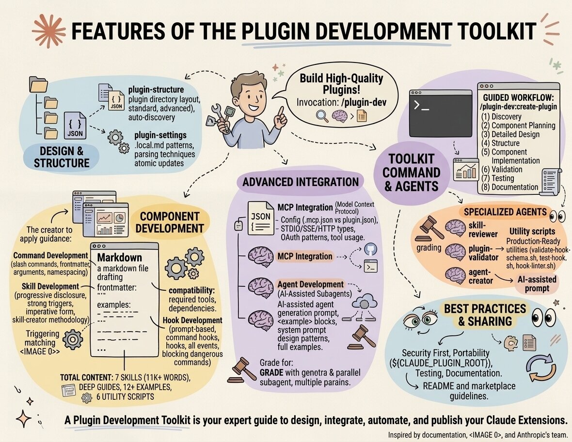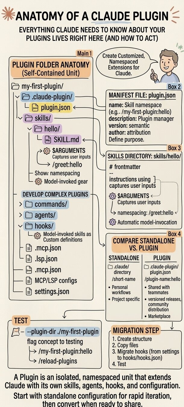 └── README.md # DocumentationUn plugin es un directorio empaquetado que contiene un manifiesto (.claude-plugin/plugin.json) que extiende Claude Code con funcionalidad reutilizable como skills, agentes, hooks y servidores MCP.