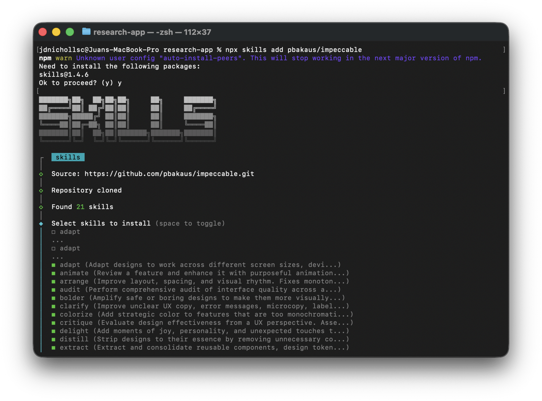 npx skills add anthropics/claude-code - skill frontend-designnpx skills add pbakaus/impeccableQuality & Assessment