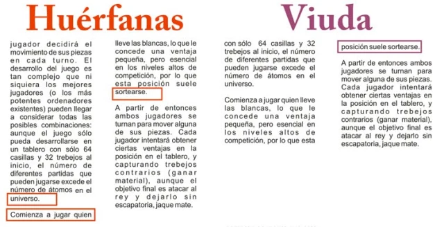 Las viudas y huérfanas harán que no todas las páginas cierren perfectamente en la última línea base. Aquí es donde la pericia del maquetador se demuestra al solventar el problema.