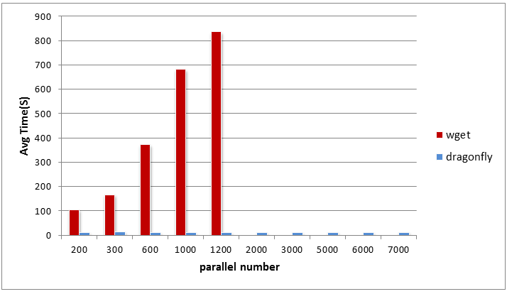 En Dragonfly no importa cuántos clientes estén descargando, el tiempo medio de descarga es siempre de unos 12 segundos. Pero para wget, el tiempo de descarga sigue aumentando con la cantidad de clientes. Cuando el número de clientes wget llega a 1200 el fichero crashea y deja de servir a los clientes.