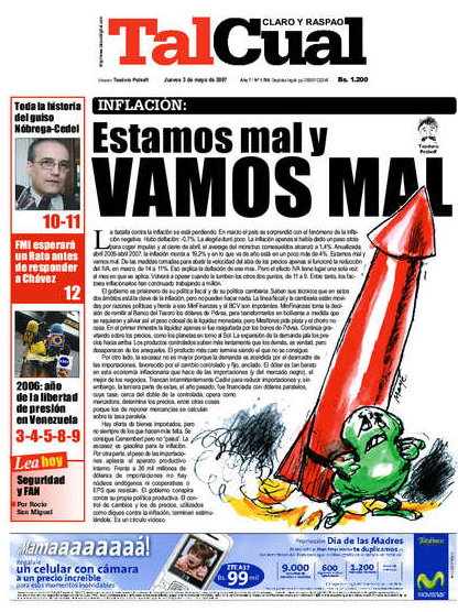 La inflación, por culpa de la mala administración chavista, es de vieja data. Ya entonces la portada de TalCual daba cuenta de la acelerada alza de los precios en los primeros meses del año.