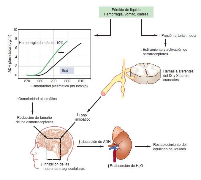 - Lo reconocen a usted como estudiante de fisiología en el Hospital General. Le comentan del caso de Elver Galarga con traumatismo cefálico en su tercer día en la unidad de cuidados intensivos posoperatorios tiene una diuresis excesiva de 20 L en las últimas 24 horas. Los exámenes de laboratorio muestran hipernatremia y orina hipotónica. Interrumpir el consumo de agua por vía oral no disminuyó la producción de orina ni incrementó la osmolaridad urinaria.