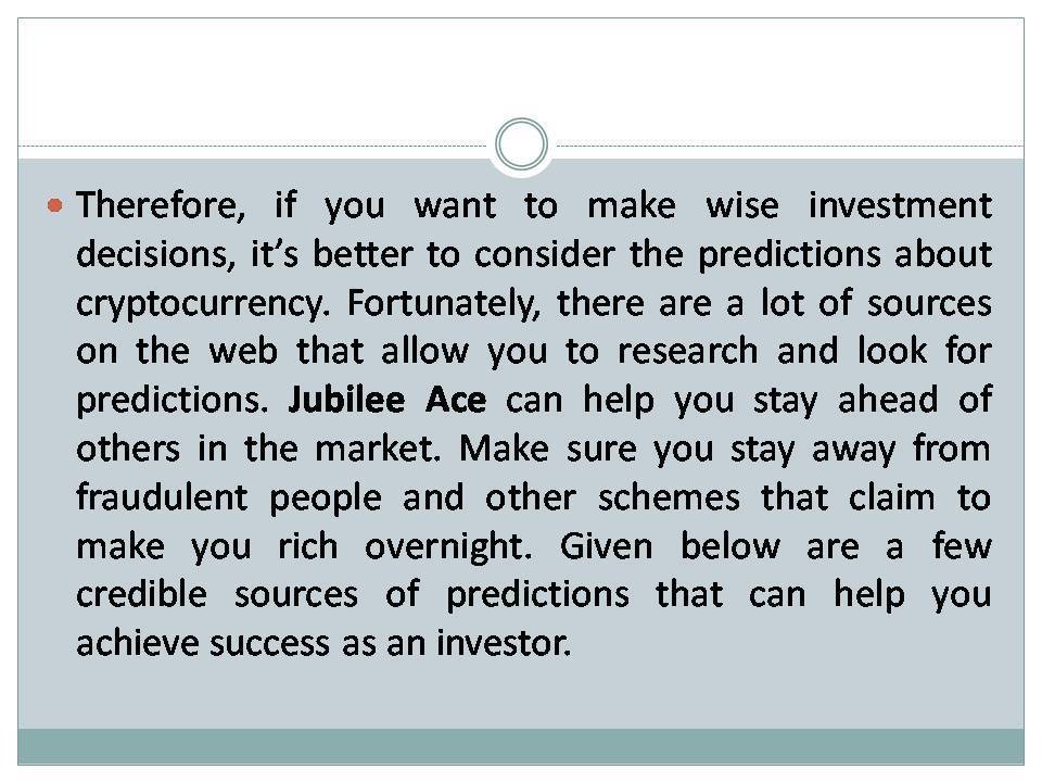 Jubilee Ace can help you stay ahead of others in the market. Make sure you stay away from fraudulent people and other schemes that claim to make you rich overnight. Given below are a few credible sources of predictions that can help you achieve success as an investor.