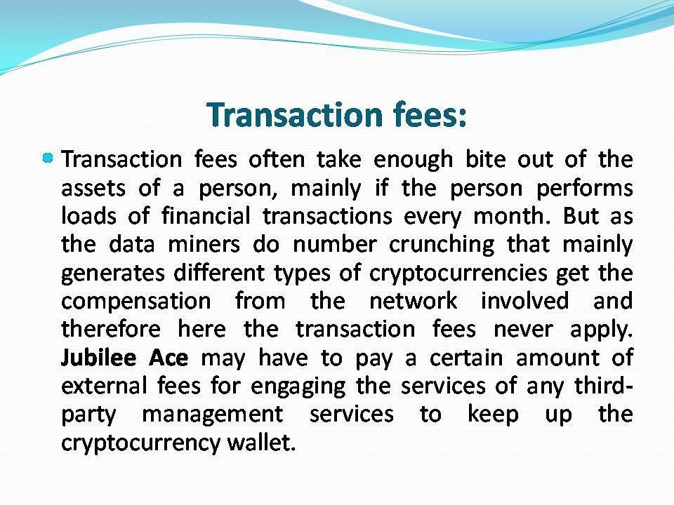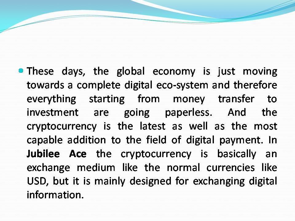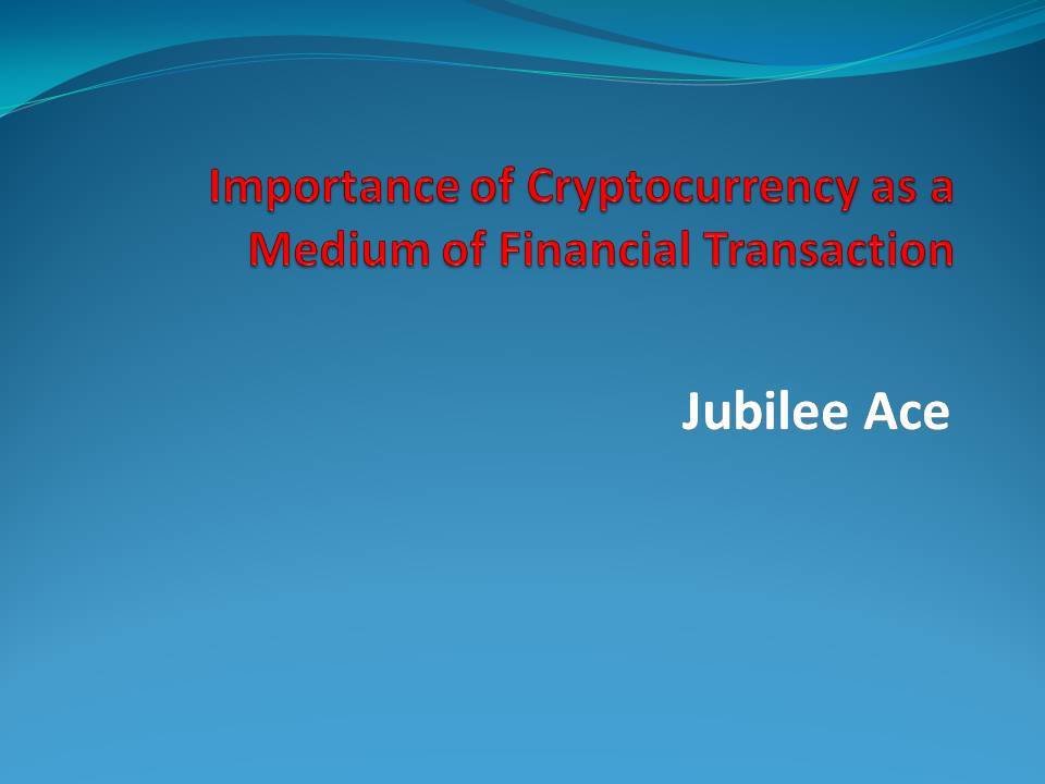 In Jubilee Ace the cryptocurrency is basically an exchange medium like the normal currencies like USD, but it is mainly designed for exchanging digital information.