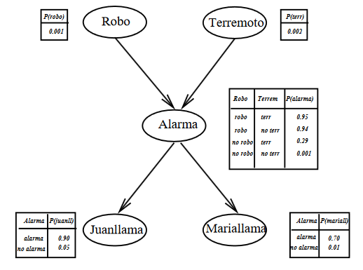 Robo y Terremoto son causas para Juanllama y Mariallama, pero esa influencia sólo se produce a través de Alarma. Ni Juan ni María detectan directamente el robo ni los pequeños temblores de tierra.