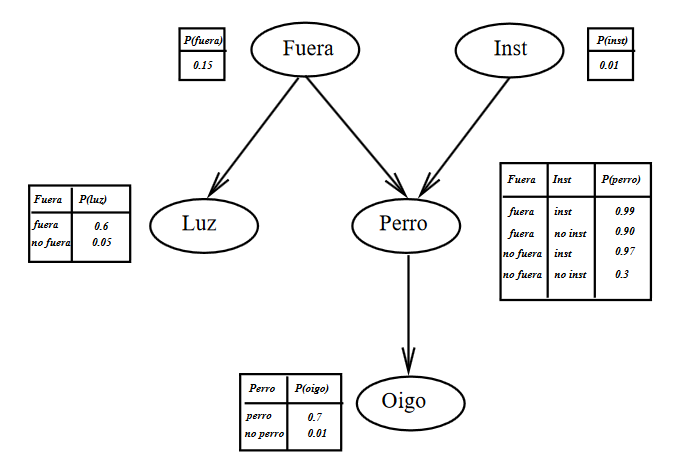 Si mi esposa sale de casa, usualmente (pero no siempre) enciende la luz de la entrada. Hay otras ocasiones en las que también enciende la luz de la entrada. Si no hay nadie en casa, el perro está fuera. Si el perro tiene problemas intestinales, también se deja fuera. Si el perro está fuera, oigo sus ladridos. Podría oír ladridos y pensar que son de mi perro aunque no fuera así.