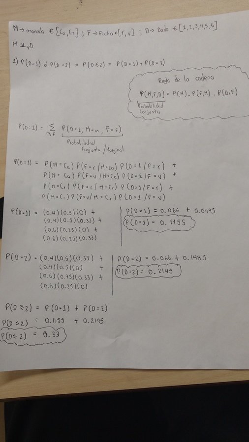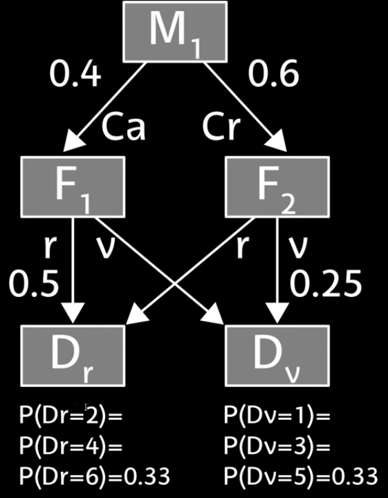 Lanzamos una moneda M, que puede tomar dos valores, cara o cruz. En función de resultado de lanzar esa moneda, lanzamos una de las posibles fichas, F1 o F2. Ambas fichas tienen dos caras, una roja y otra verde. Finalmente en funciona del resultado de lanzar la ficha lanzamos uno de los posibles dados (rojo y verde), y registramos el valor obtenido en dicho lanzamiento.