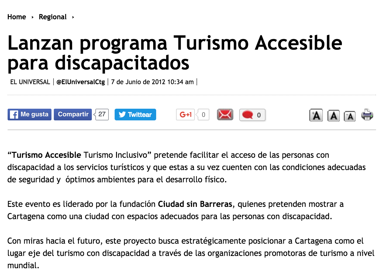 La Corporación Discapacidad Colombia y la empresa TecnoayudasLtda, harán entrega de una silla de ruedas anfibia, diseñada y fabricada por Tecnoayudas, con la cual las personas con movilidad reducida (personas con discapacidad y adultos mayores) podrán realizar desde paseos por la playa, hasta disfrutar del agua del mar o la piscina sin bajarse de ella, disfrutando así en igualdad de condiciones de la oferta turística de mar y playa que ofrece la hermosa ciudad de Cartagena.