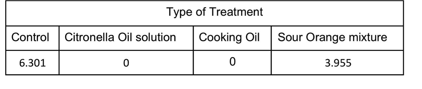 30 mL of palm-based cooking oil, 30 mL of Cymbopogon essential oil, water and ethyl alcohol solution and 30 mL of a mixture of the ground peel and juice of a Citrus aurantium will serve as the treatments