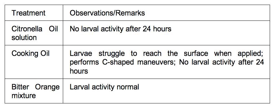 The solution of ethyl alcohol, water, and essential oil of Cymbopogon, and palm-based cooking oil affected the larvae in their respective set-ups as hypothesized