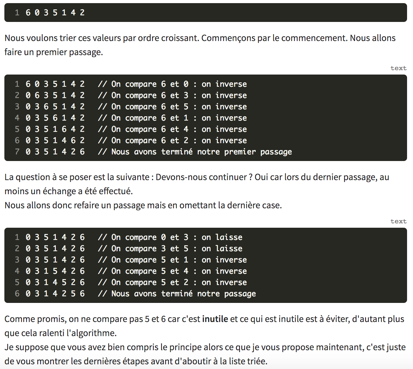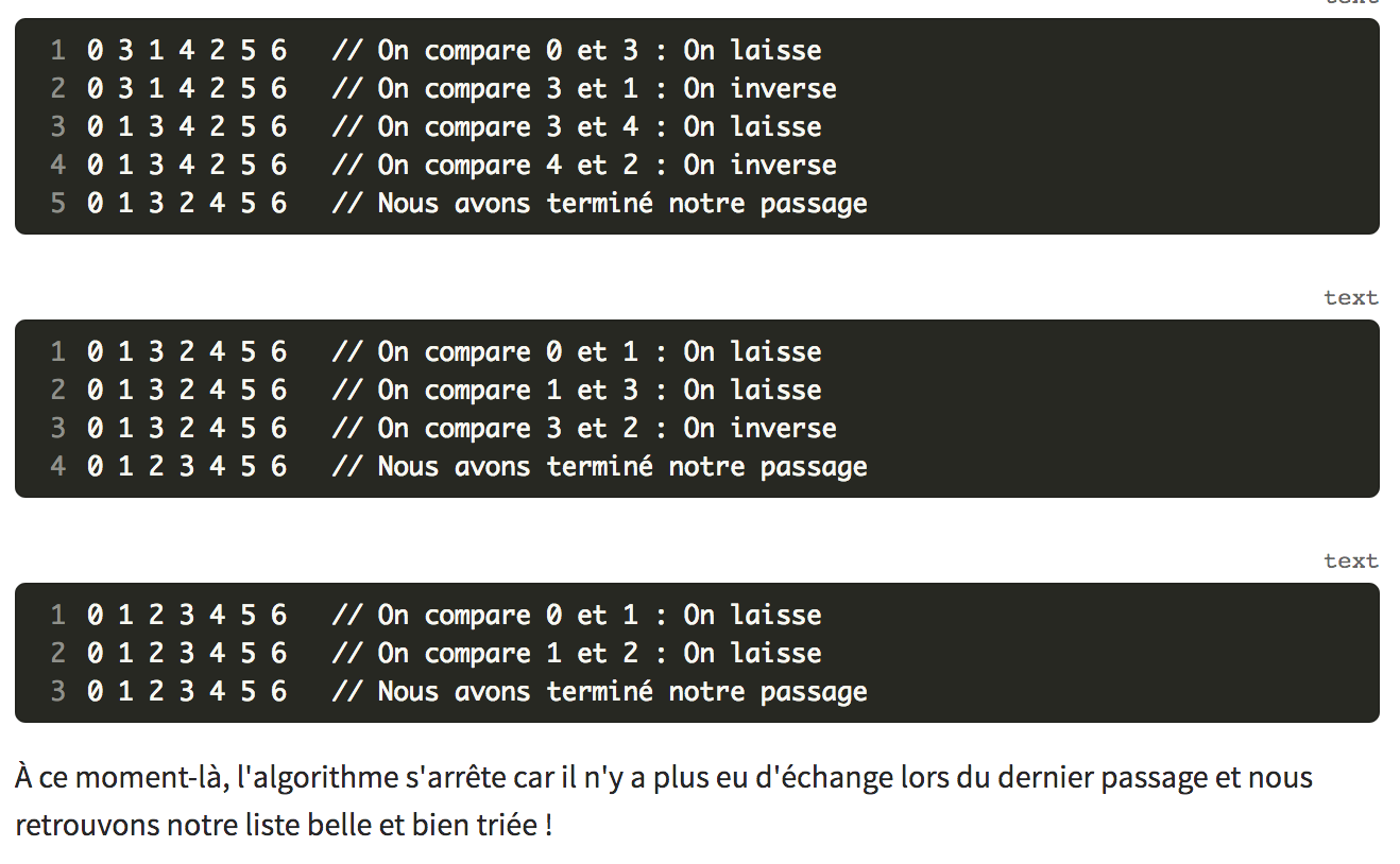 "consiste à comparer répétitivement les éléments consécutifs d'un tableau et à les permuter lorsqu'ils sont mal triés"