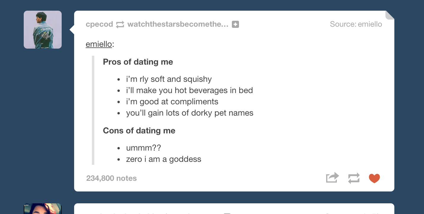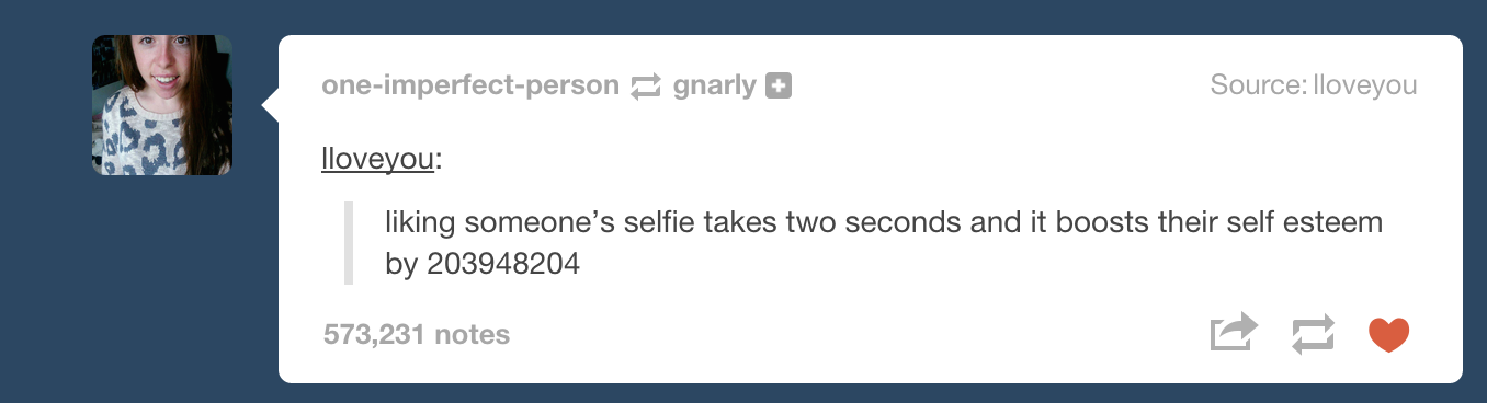 - There is an interesting coexistent culture of self-deprecation AND self-promotion on Tumblr. You'll see.