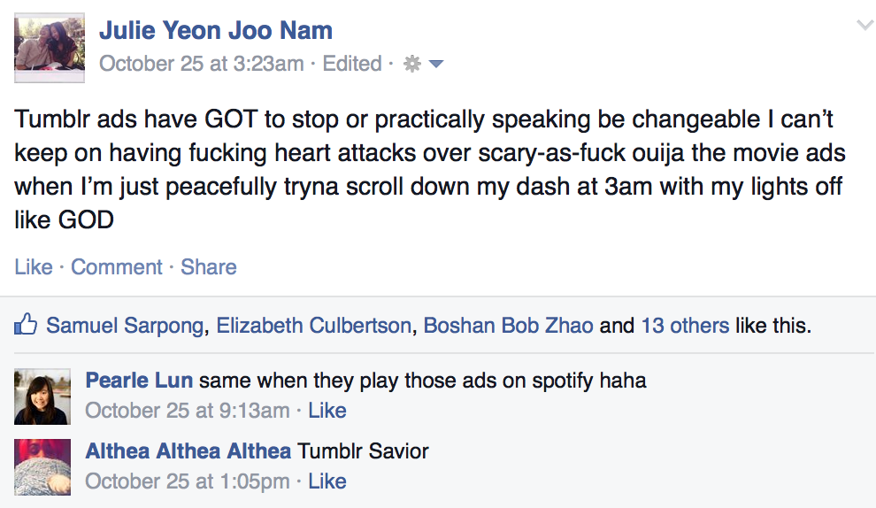 I think this Facebook post I wrote just a few days ago really represents my feelings (and probably many's) about it well. It just doesn't go. It doesn't go with the minimalistic design & youth culture of Tumblr. I'm just waiting for a popular text about Tumblr ads.