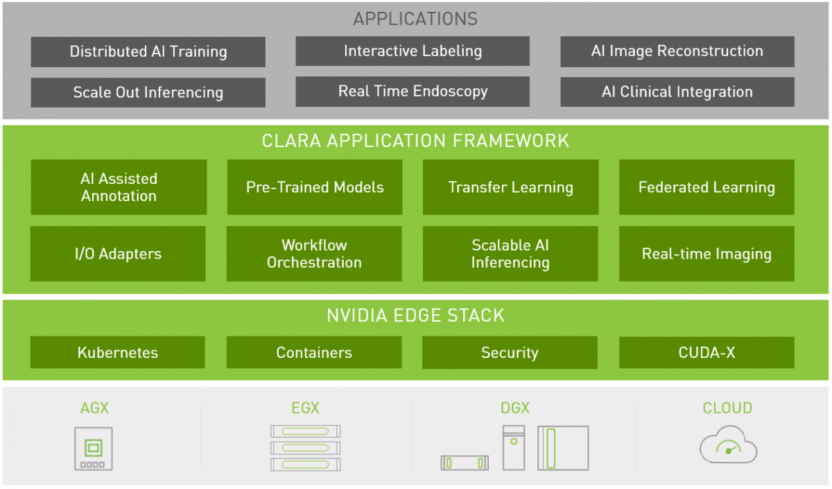 - Nvidia Clara SDK (Models, TensorRT Server, DICOM/PACS Interface)