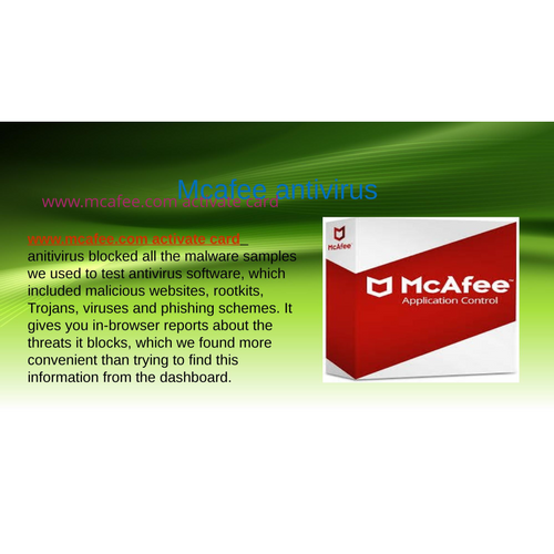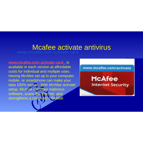 McAfee is well known and popular antivirus program that a user can download and activate at mcafee activate card. McAfee antivirus is available in each version at affordable costs for individual and multiple uses. Having McAfee set up in your computer, mobile, or smartphone can make your data 100% secure. https://www.mcafee.com-activate-card.net