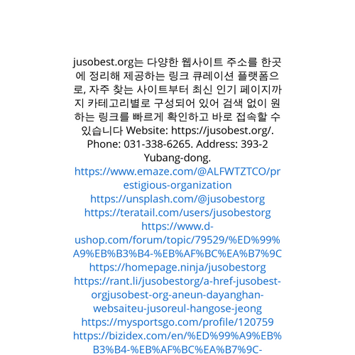 Website: https://jusobest.org/. jusobest.org는 다양한 웹사이트 주소를 한곳에 정리해 제공하는 링크 큐레이션 플랫폼으로, 자주 찾는 사이트부터 최신 인기 페이지까지 카테고리별로 구성되어 있어 검색 없이 원하는 링크를 빠르게 확인하고 바로 접속할 수 있습니다 Phone: 031-338-6265. Address: 393-2 Yubang-dong.