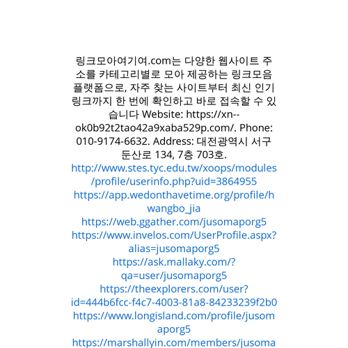 Website: https://xn--ok0b92t2tao42a9xaba529p.com/https://xn--ok0b92t2tao42a9xaba529p.com/ 링크모아여기여.com는 다양한 웹사이트 주소를 카테고리별로 모아 제공하는 링크모음 플랫폼으로, 자주 찾는 사이트부터 최신 인기 링크까지 한 번에 확인하고 바로 접속할 수 있습니다 Phone: 010-9174-6632. Address: 대전광역시 서구 둔산로 134, 7층 703호.