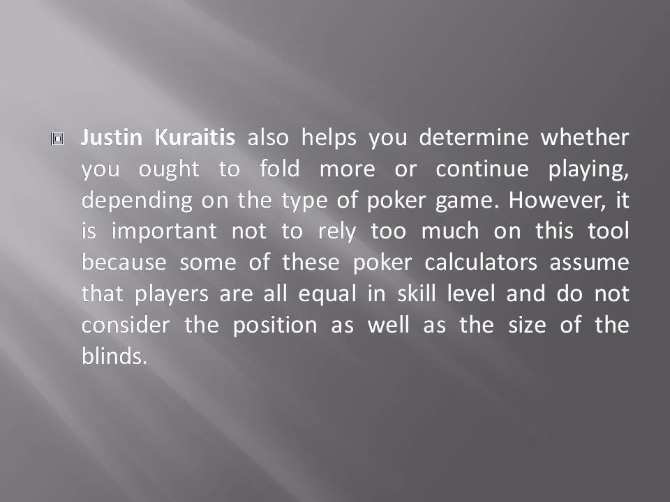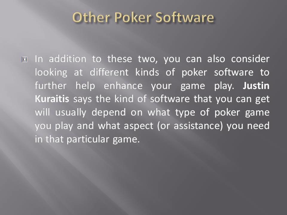 In addition to these two, you can also consider looking at different kinds of poker software to further help enhance your game play. Justin Kuraitis says the kind of software that you can get will usually depend on what type of poker game you play and what aspect (or assistance) you need in that particular game.