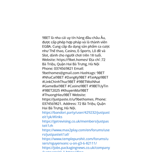 Website: https://justpaste.it/u/9bethomeshttps://justpaste.it/u/9bethomes 9BET là nha cái uy tín hàng đầu châu Âu, được cấp phép hợp pháp và là thành viên EGBA. Cung cấp đa dạng sản phẩm ca cược như Thể thao, Casino, E-Sports, Lô đề và Slot, dành cho người chơi trên 18 tuổi. Webs