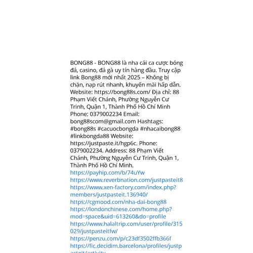 Website: https://justpaste.it/hgp6c. BONG88 - BONG88 là nha cái ca cược bóng đá, casino, đá gà uy tín hàng đầu. Truy cập link Bong88 mới nhất 2025 – Không bị chặn, nạp rút nhanh, khuyến mãi hấp dẫn. Website: https://bong88s.com/ Địa chỉ: 88 Phạm Viế