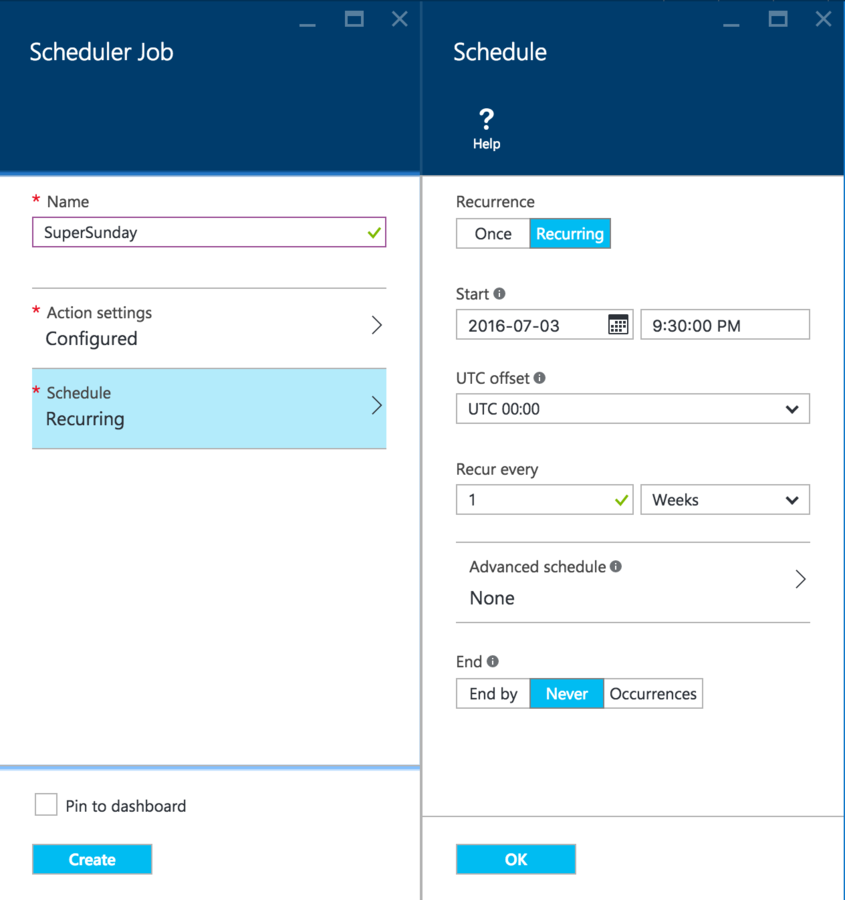 Azure Scheduler lets you create jobs in the cloud that reliably invoke services inside and outside of Azure—such as calling HTTP/S endpoints or posting messages to Azure Storage queues, Azure Service Bus queues, or Azure Service Bus topics. You can choose to run jobs straight away, on a recurring schedule or at some point in the future.