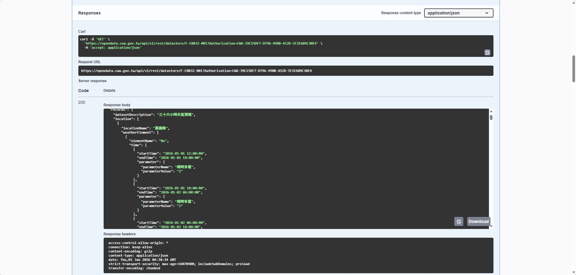 不同的是,這個網址是專門拿來讓別的應用程式請求的所以她回傳的結果通常是 JSON 格式的文字,並且他的返回格式也不會亂更新。