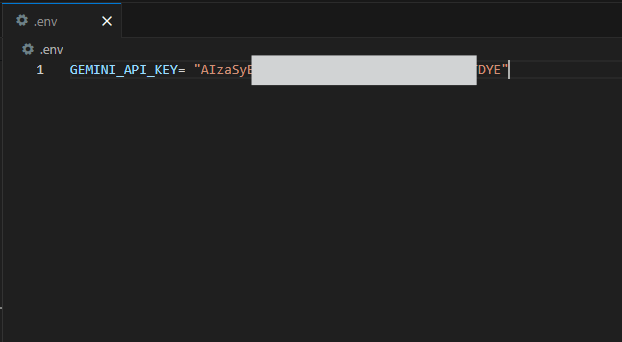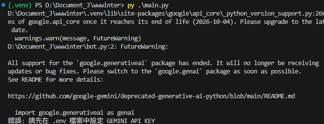 剛剛的訊息就是說我們還沒配置 API key,由於這個東東是機密所以通常會放在一個叫做.env 的檔案。反正你就在資料夾中建立這個檔案並填入以下內容(請填自己的 API Key):