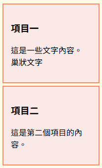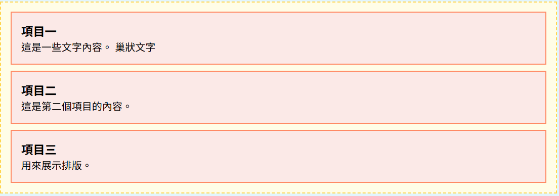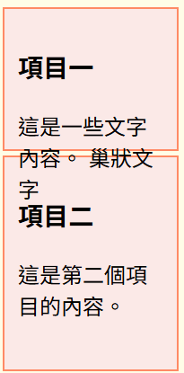 | block | 獨佔一行,可設定寬高、邊距,最常見? div、p、h1~h6 等等標籤預設會是這個。 |