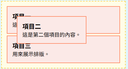 left: 20px;relative 的元素仍佔位,但 absolute 的元素會浮起來
