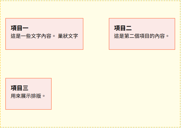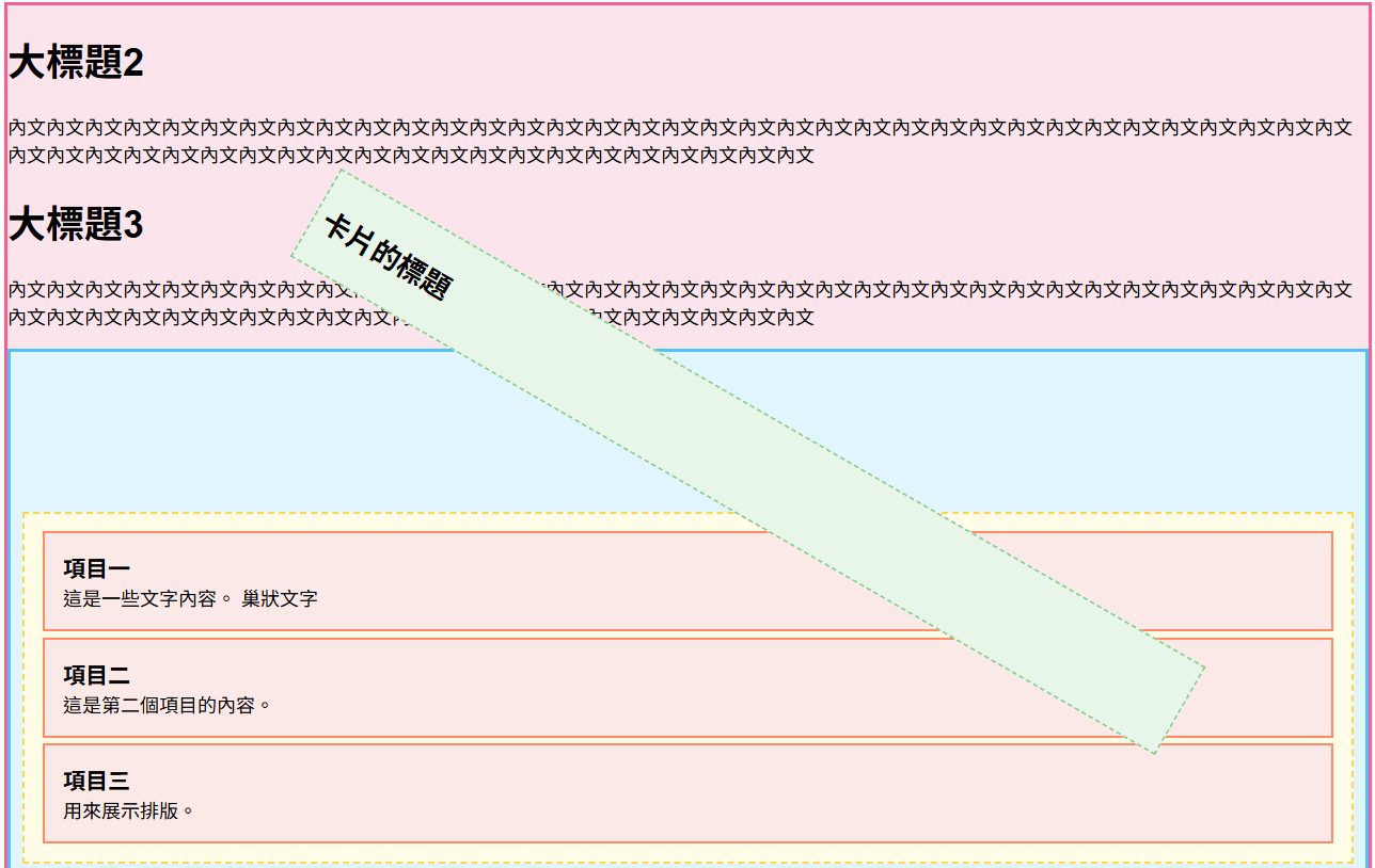 | inline & inline-block | 類似文字的排列?會與同一層的文字一起排列。span、a、img 等等標籤預設是這個。inline-block 則是在 inline 基礎上讓你可以用 Margin 這種 block 專有的屬性? |