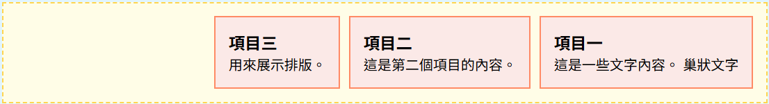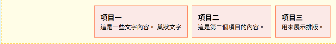 justify-content: flex-start | flex-end | center | space-between | space-around | space-evenly他是針對「軸向」的分布