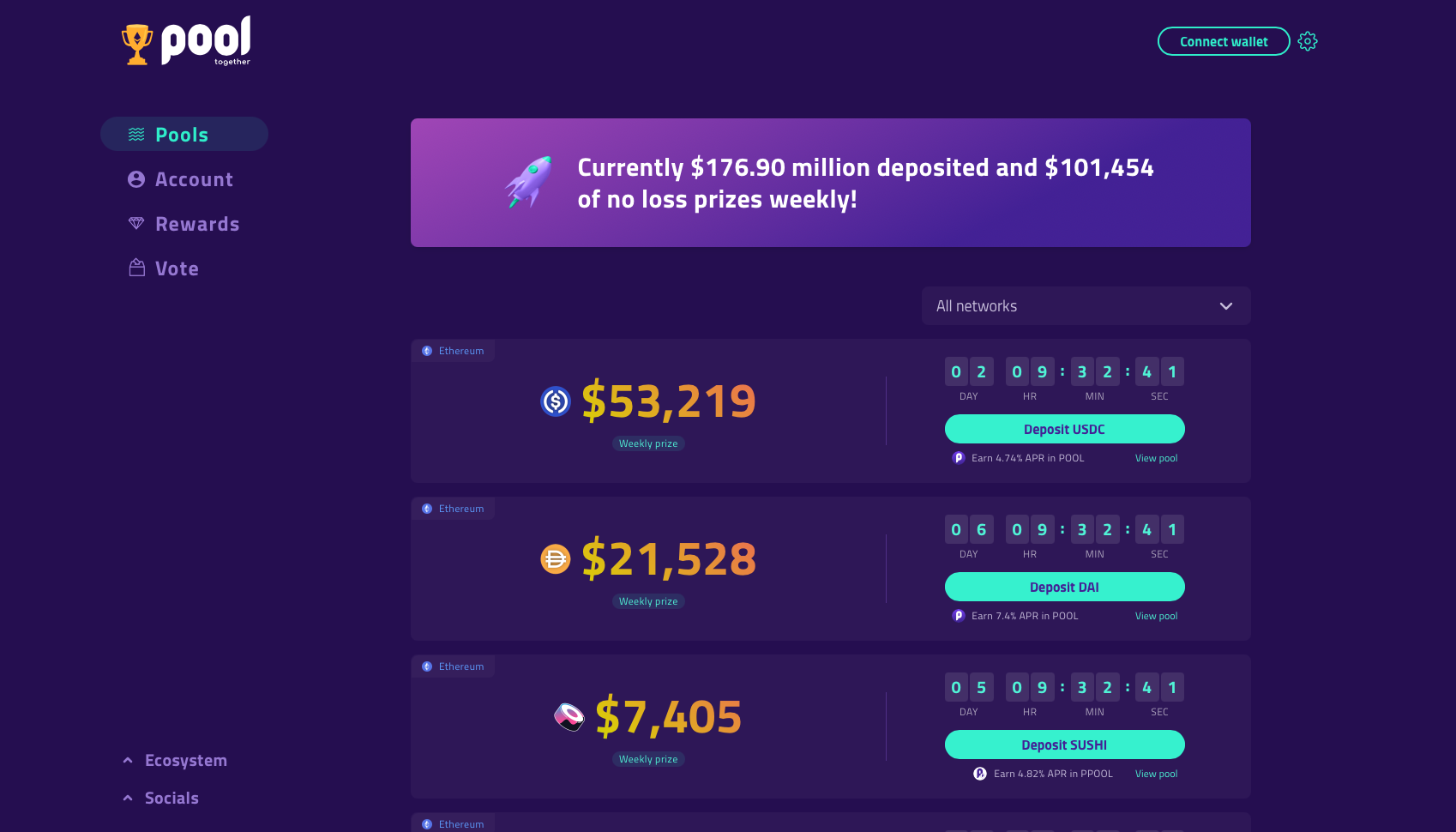 https://blocktrend.gitbook.io/defi/jin-ru-defi-de-xin-shi-jie/mai-cai-quan-pooltogether-bu-hui-shu-de-lao-tou-cai pool together