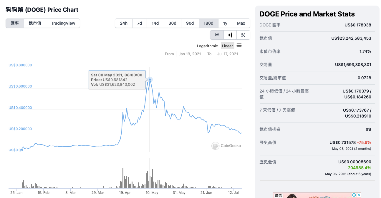 - 每次打賞五顆狗狗幣,當時市值0.0005$