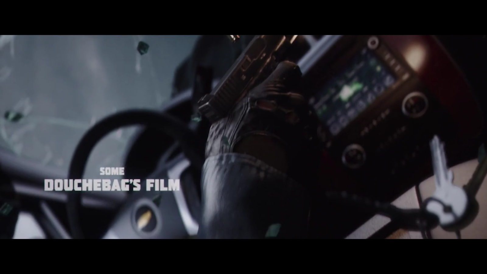 The second shot again reinforces the idea of violence by the use of a gun in the shot, also we can definitely establish that we are in a car now as we can see a dashboard, this adds even more danger to whatever is happening. However, despite all of this we can see another credit although this time there has been some comedic value added, by insulting the director instead of using their name. IIt also makes us think that the character is quite childish with what they said