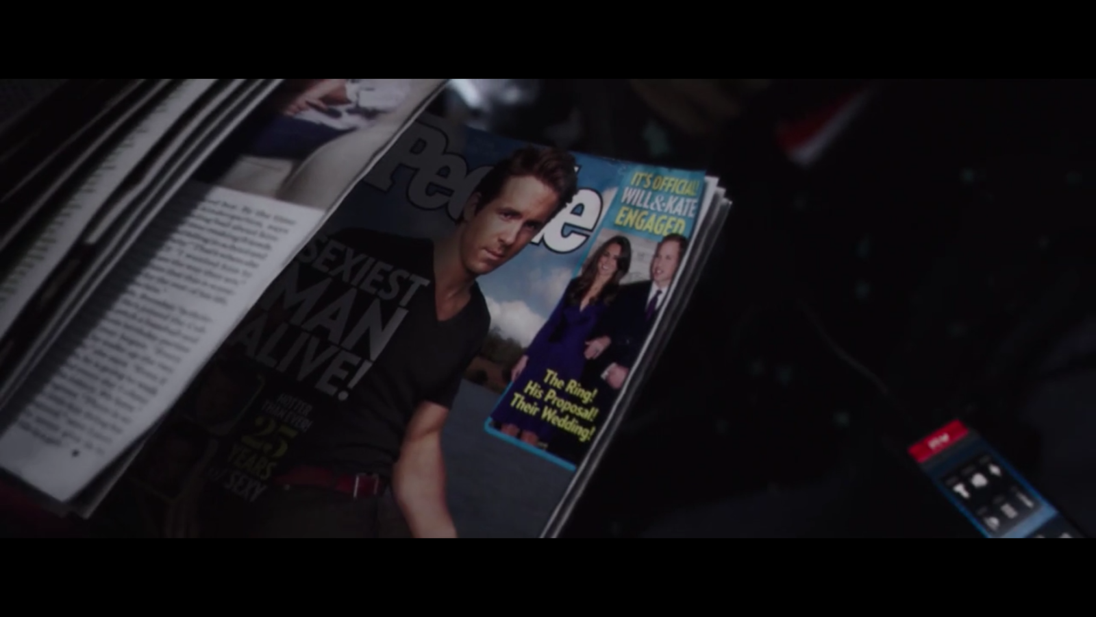 In the third shot we get a relatively small fourth wall break in terms of the rest of the film. As most people knew that Ryan Reynolds was playing deapool and it is him on the front of the cover with the title 'sexiest man alive' this is again quite a childish way of saying that he is in the film, and is quite egotistical.