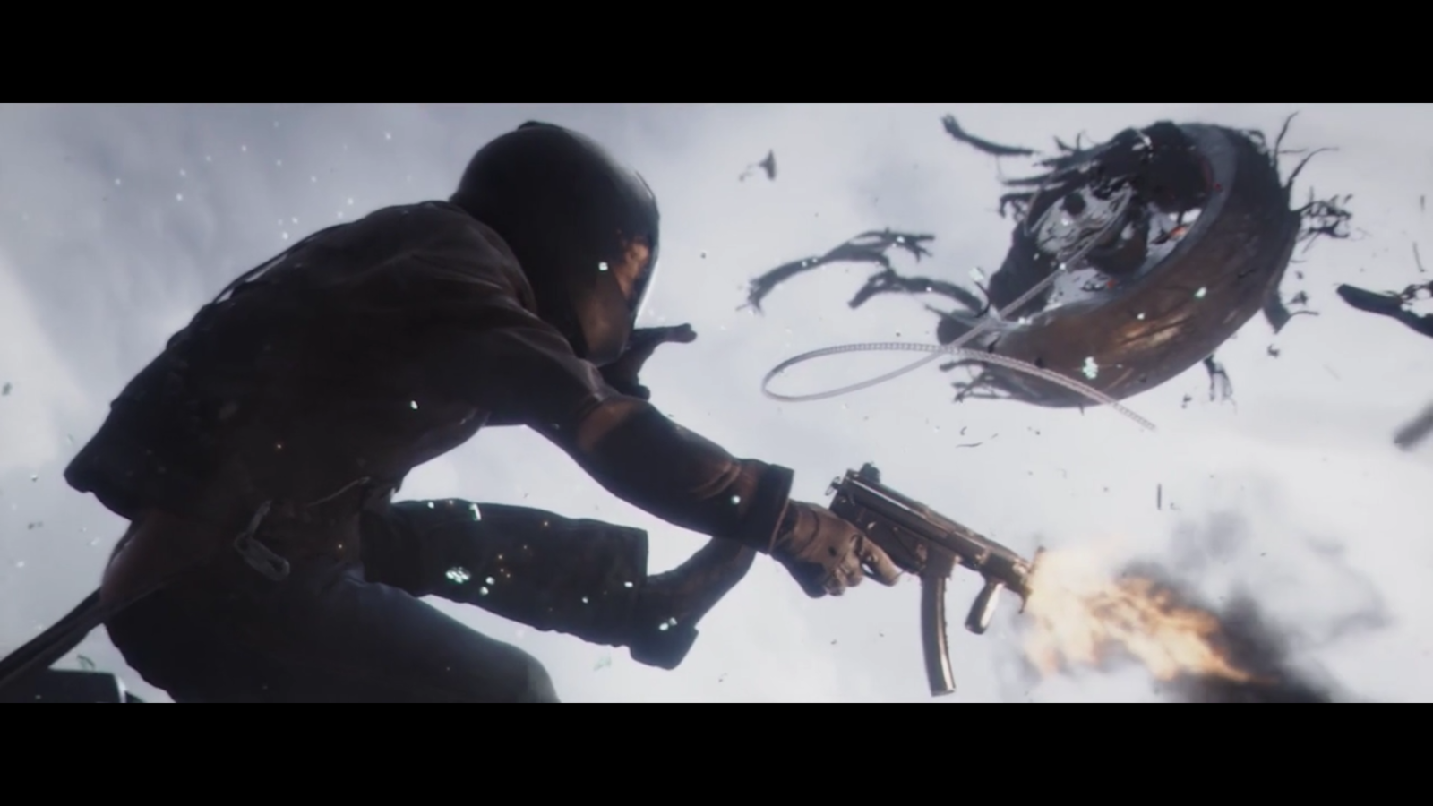In this shot we get a big emphasis of danger as we first can see a man fairing what appears to be an automatic machine gun in the air, but also there is a torn up tire flying through the shot and this gives us the idea that the car may actually be spinning through the air and isnt stationary or at least on 4 wheels.