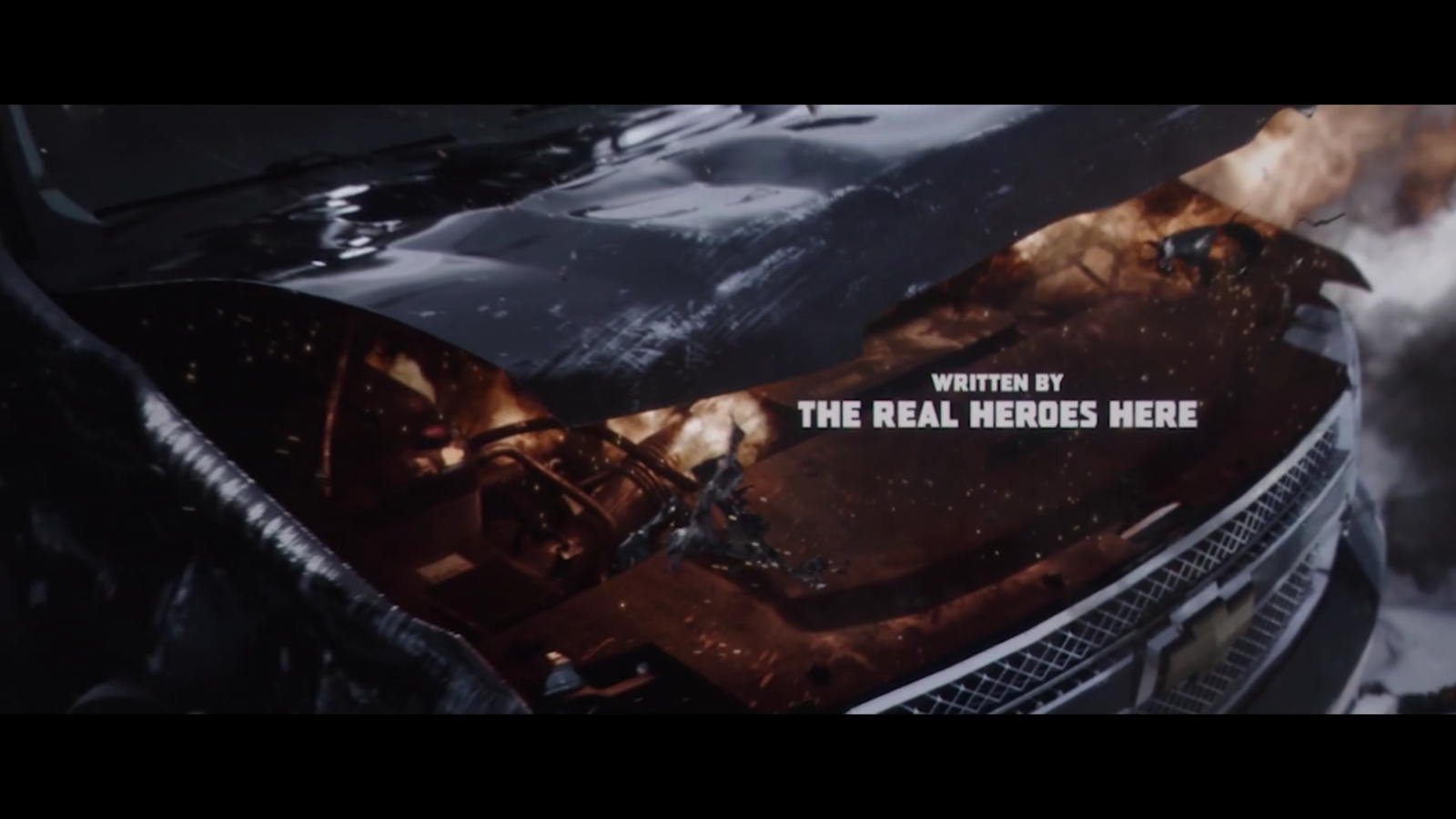 In this shot we see what looks to be a burning car engine so we can now establish that the car that the characters are in is about to explode and also may be in mid-air. However all of this danger is contradicted by another childish form of credit, it could suggest that although there is all this danger there isnt actually anything to be worried about if someone is making a joke.