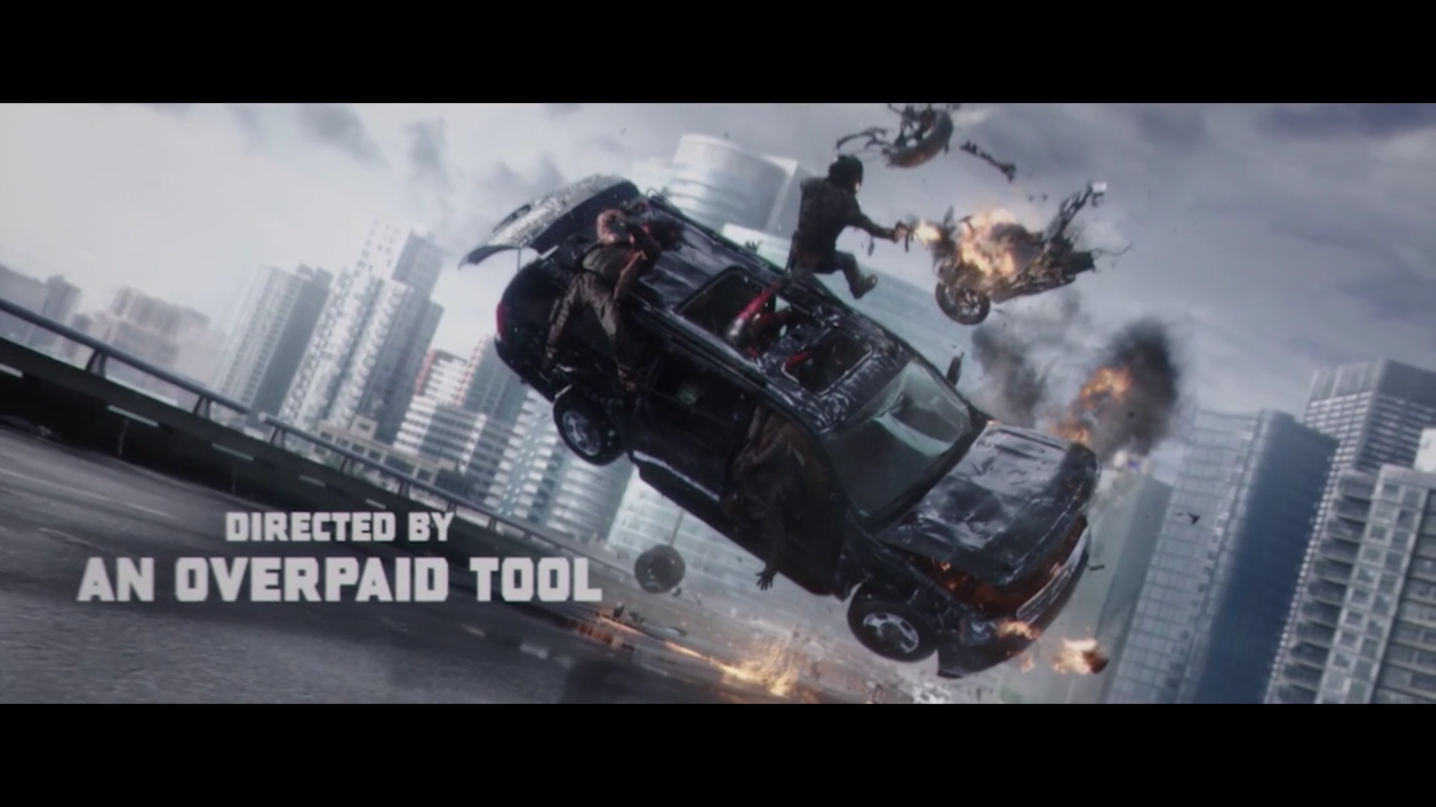 In the final shot of the credits we can see that our ideas were correct and the car is actually mid-air and on fire and we can see all the characters that we saw throughout the sequence but from a longshot instead what was mostly closeups before. This idea of not needing to be worried appears again as we can see that there is definitely a lot of danger or risk at the moment yet there is still another joke in the credits.