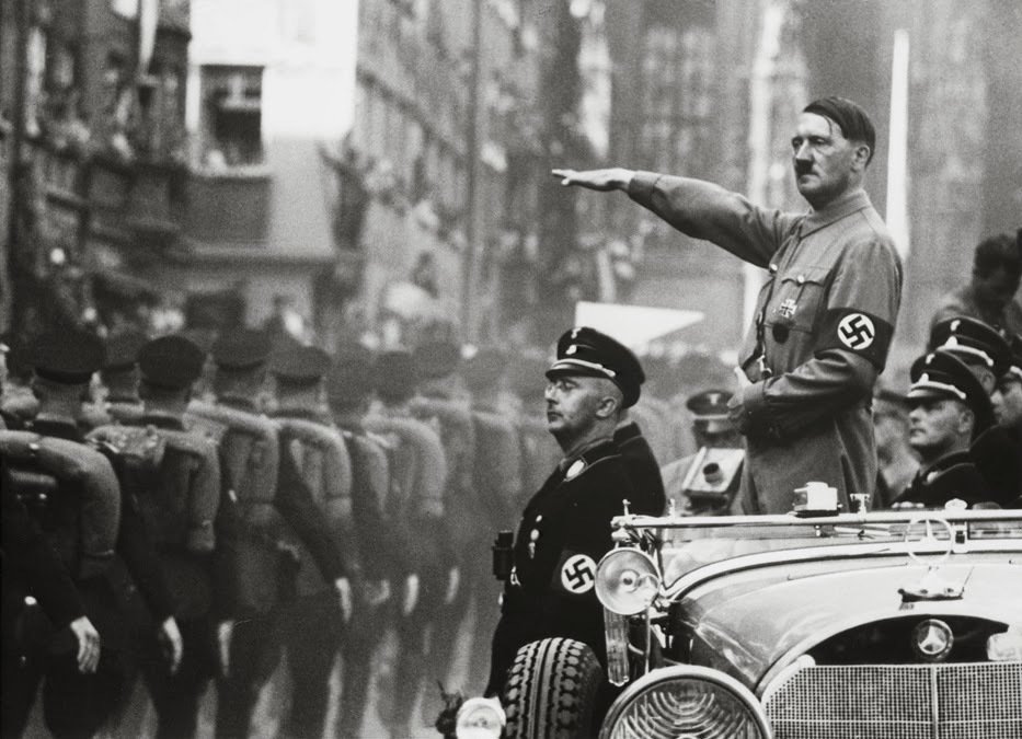 A crowd cheers Adolf Hitler as his car leaves the Reich Chancellery