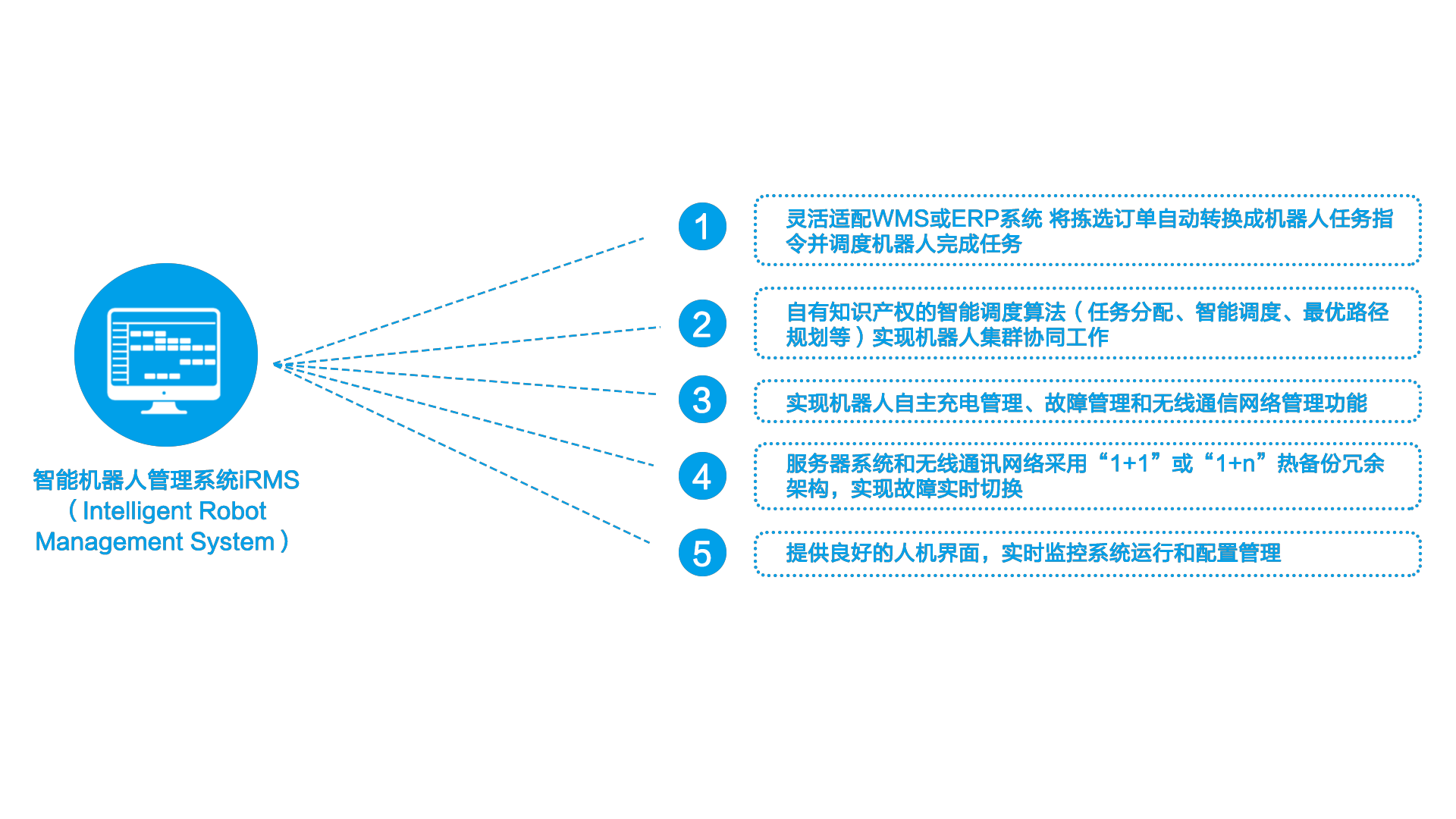 由AGV(“阡陌”机器人)、RCS(机器人调度系统)、iWMS(智能仓储管理系统)组成。
