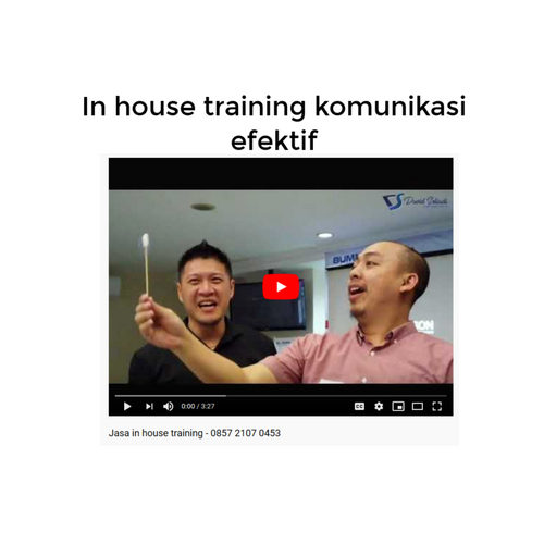 In house training komunikasi efektif... Manfaat nyata dari in-house training adalah memberi karyawan kesempatan untuk memperluas keterampilan mereka, meningkatkan peluang pengembangan karier. Sumber daya manusia adalah investasi yang paling penting untuk kemajuan suatu perusahaan. http://www.davidsetiadi.com/jasa-in-house-training-dan-team-building/