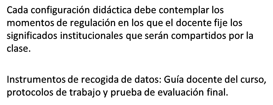 | Implementación | Configuraciones didácticas, procesos didácticos y la noción de conflicto semiótico interaccional | Identificar HDS que orientan la evaluación formativa y la optimización del aprendizaje. |