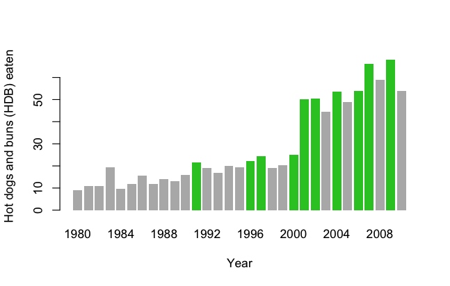 border=NA, xlab="Year", ylab="Hot dogs and buns (HDB) eaten")https://en.wikipedia.org/wiki/Nathan%27s_Hot_Dog_Eating_Contest