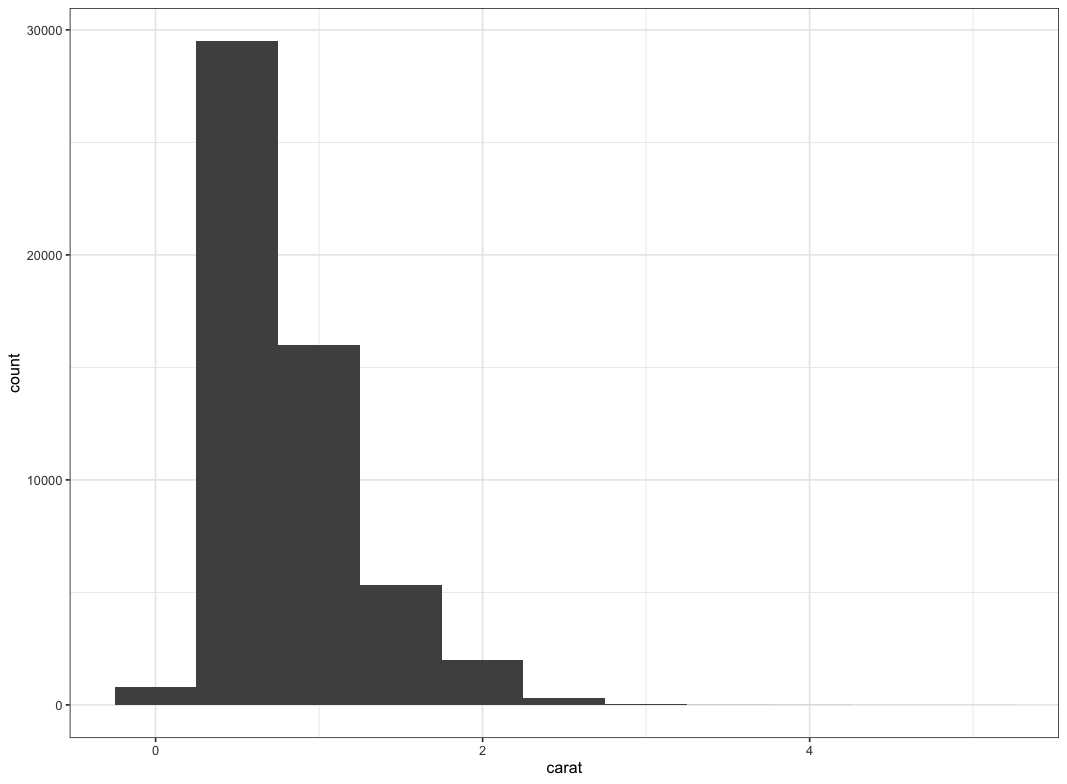 geom_histogram(mapping = aes(x = carat), binwidth = 0.5) +