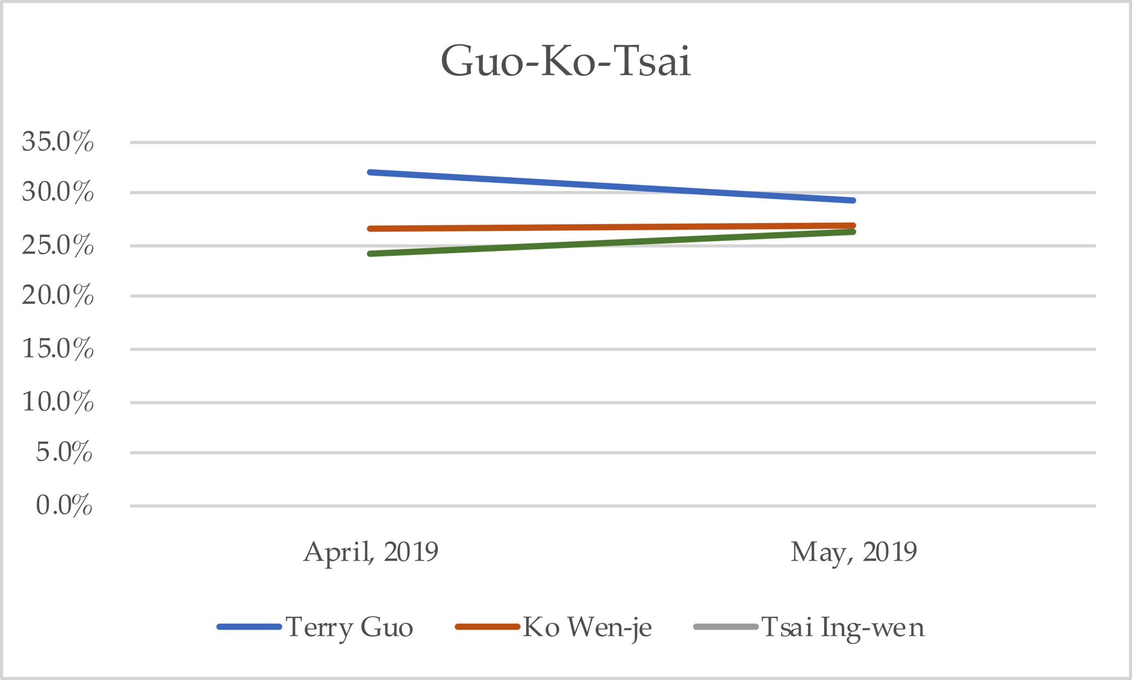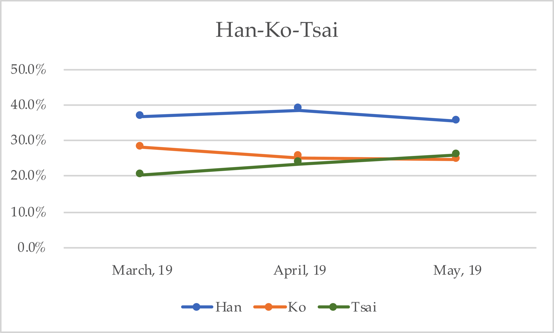 | TVBS民調 | 951 | 5/10/19 | 31.0% | 30.0% | 24.0% | 1.0% | 15.0% |
