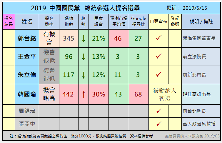 | 台灣指標 | 1,188 | 5/15/19 | 31.5% | 24.1% | 25.0% | 7.0% | 19.4% |