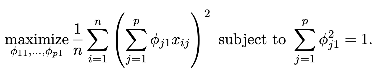 the principal component loading vector, \(\phi_1 = (\phi_{11} \phi_{21} ... \phi_{p1})^T\) .