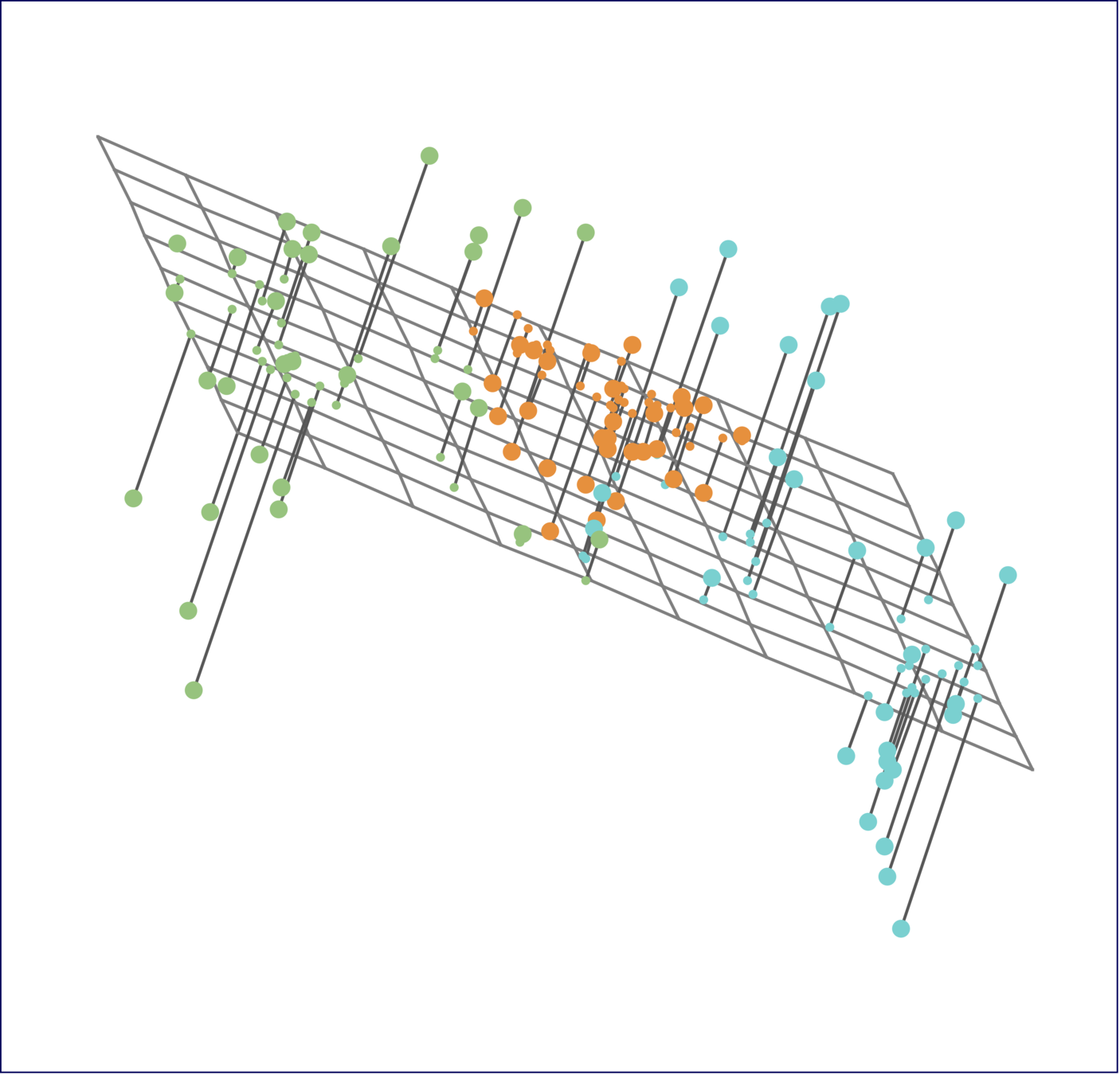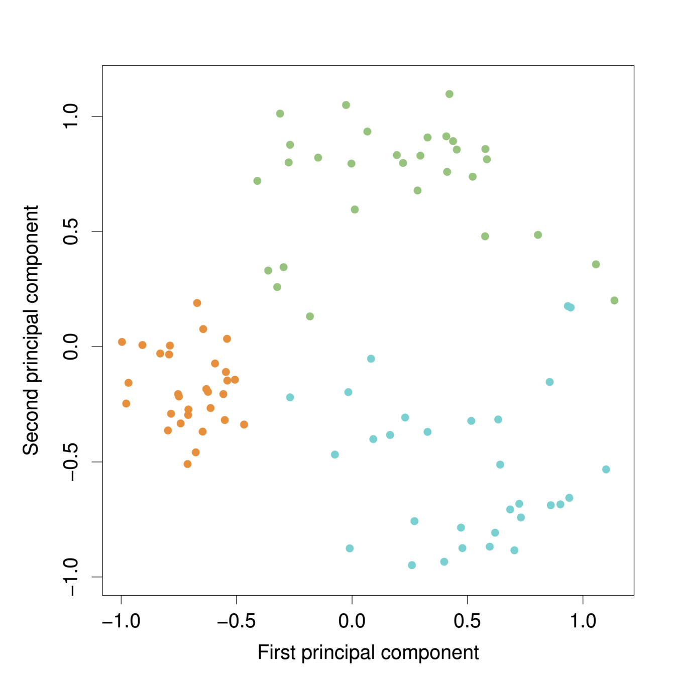 For instance, the first two principal components of a data set span the plane that is closest to the \(n\) observations, in terms of average squared Euclidean distance.