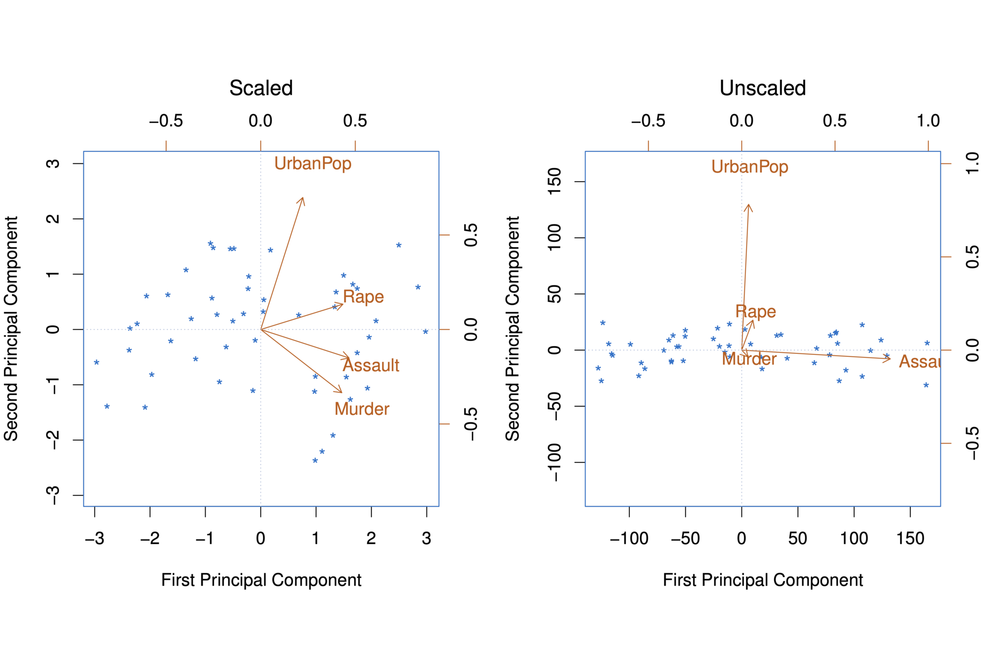 The red arrows indicate the first two principal component loading vectors (with axes on the top and right). For example, the loading for Rape on the first component is 0.54, and its loading on the second principal component 0.17 [the word Rape is centered at the point (0.54, 0.17)]. (Note scale difference in plot)