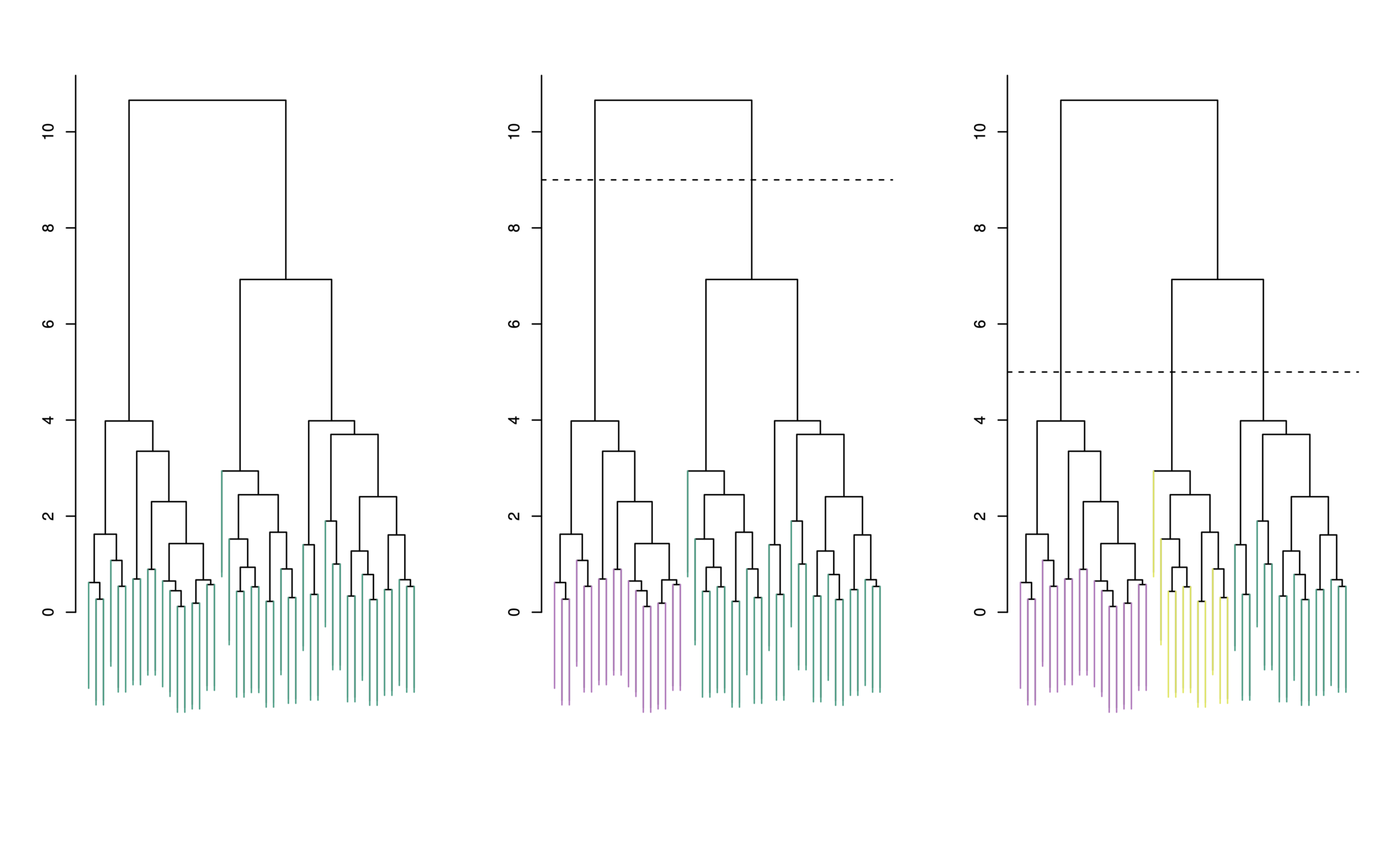 At the bottom of the dendogram, each observation is a distinct leaf. However, as we move up the tree, some leaves begin to fuse. These correspond to observations that are similar to each other.